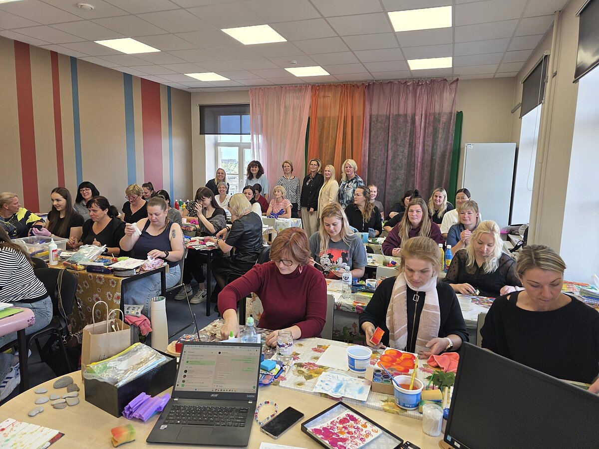 Filiāles metodiķe Evija Kutra informēja par lekciju plānošanu un telpu noslodzi. Viesiem bija iespēja klātienē vērot studiju norisi studiju kursā “Kultūras izpratnes un pašizpausmes mākslā mācību jomas saturs un mācīšanās pieejas”, kur studenti aktīvi un radoši iesaistījās mācību procesā (studiju programma “Pirmsskolas skolotājs”, programmas direktore Antra Randoha).